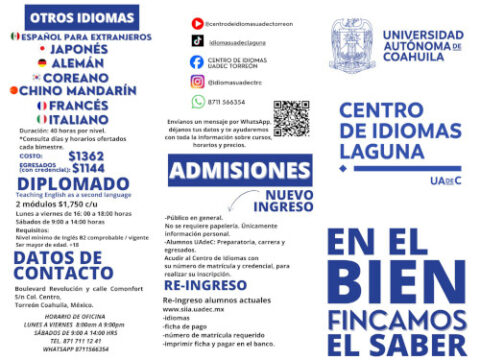 TORREÓN, Coahuila. 15 de octubre de 2025. El Centro de Idiomas Unidad Lagunade la Universidad Autónoma de Coahuila invita a la comunidad universitaria y alpúblico en general a inscribirse a sus cursos de idiomas correspondientes al próximoperiodo, con opciones en modalidad entre semana o sabatina, con programas paraniños, adolescentes y adultos. Las inscripciones para los cursos de inglés de lunes a viernes para nuevo ingreso seencuentran abiertas desde el 6…