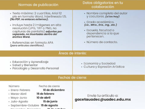 SALTILLO, Coahuila. 26 de noviembre de 2025. La Universidad Autónoma deCoahuila a través de su Gaceta, convoca a la comunidad universitaria a participar ensus próximas ediciones, en las áreas de Educación y Aprendizaje, Salud y Bienestar,Psicología y Desarrollo Personal, Economía y Sociedad y Cultura y ExpresiónArtística. Las publicaciones deberán de cumplir con las siguientes normas: Texto máximo de 2cuartillas, Arial 12 puntos en formato Word, interlineado 1.5, no PDF ni…
