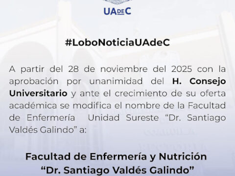 SALTILLO, Coahuila. 4 de diciembre de 2025. La Universidad Autónoma de Coahuilaaprobó, en pasada Sesión Extraordinaria del Honorable Consejo Universitario, lamodificación del nombre de la Facultad de Enfermería “Dr. Santiago Valdés Galindo”y la Coordinación de Agenda Ambiental, con el objetivo de fortalecer su identidadacadémica y ampliar el alcance de sus funciones. El cambio de denominación de la Facultad de Enfermería “Dr. Santiago ValdésGalindo” de la Unidad Sureste, que a partir…