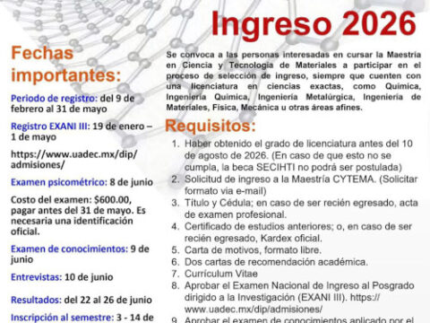 SALTILLO, Coahuila. 25 de febrero de 2026. La Universidad Autónoma de Coahuilaa través de la Facultad de Ciencias Químicas, convoca a egresados de licenciaturasen ciencias exactas como Química, Ingeniería Química, Ingeniería Metalúrgica,Ingeniería de Materiales, Física, Matemáticas o de áreas afines, a postularse paraingresar a la Maestría en Ciencia y Tecnología de Materiales para el semestreagosto-diciembre 2026. El periodo de registro cierra el 31 de mayo, examen psicométrico el 8 de…