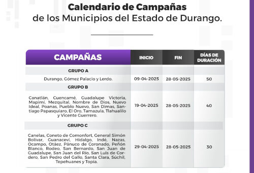 Grupo C: Canelas, Coneto de Comonfort, General Simón Bolívar, Guanaceví, Hidalgo, Indé, Nazas, Ocampo, Otáez, Pánuco de Coronado, Peñón Blanco, Rodeo, San Bernardo, San Juan de Guadalupe, San Juan del Río, San Luis de Cordero, San Pedro del Gallo, Santa Clara, Súchil, Tepehuanes y Topia. Del 29 de abril al 28 de mayo de 2025.