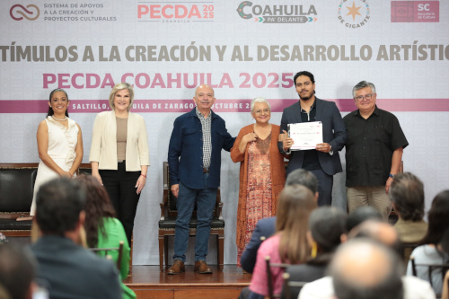 Saltillo, Coahuila; 19 de agosto de 2025.– El Gobierno del Estado de Coahuila de Zaragoza, a través de la Secretaría de Cultura, en colaboración con la Secretaría de Cultura del Gobierno de México y el Sistema de Apoyos a la Creación y Proyectos Culturales (SACPC), realizó la entrega de los estímulos del Programa de Estímulo a la Creación y Desarrollo Artístico (PECDA) Coahuila 2025, con el propósito de fortalecer e impulsar el trabajo de las y los creadores coahuilenses.