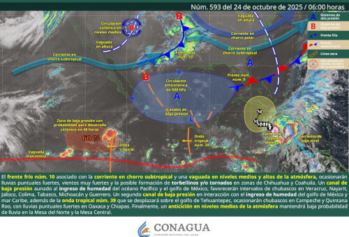 Saltillo, Coahuila de Zaragoza; a 24 de octubre de 2025. – La Secretaría de Gobierno, a través de la Subsecretaría de Protección Civil del Estado, informa que el Frente Frío número 10 recorrerá el norte del país, asociado con la corriente en chorro subtropical, ocasionarán lluvias puntuales fuertes en la Región Norte de Coahuila, así como rachas de viento de 65 a 80 km/h y posibles torbellinos y/o tornados en el noroeste del Estado.
