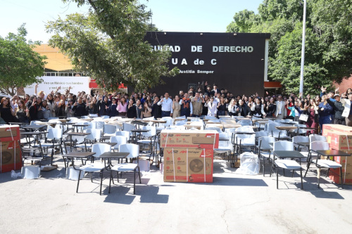 en la Facultad de Derecho, asimismo, hizo entrega de 120 mesabancos y 25 equipos