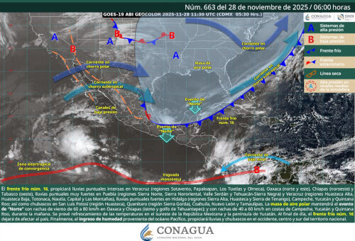 Durante el domingo 30 de noviembre, un nuevo frente frío se aproximará e ingresará al norte y noreste del territorio nacional. En interacción con una línea seca en Coahuila, un canal de baja presión en el noreste y oriente del país, una vaguada en niveles medios y altos de la atmósfera, la corriente en chorro polar y un río atmosférico, generará un descenso adicional de temperatura, así como vientos fuertes, lluvias y chubascos en el Estado.