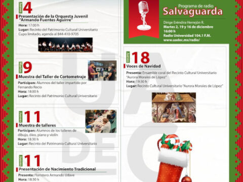 SALTILLO, Coahuila. 1 de diciembre de 2025. La Universidad Autónoma de Coahuilaa través de la Coordinación de Difusión y Patrimonio Cultural, invita en este mes dediciembre a diversas actividades culturales y artísticas que tiene programadas en elRecinto del Patrimonio Cultural Universitario, ubicado en calle Hidalgo 211 a unospasos de la Catedral y el Recinto “Aurora Morales de López”, en lo Calle de RamosArizpe 299, casi esquina con Allende en el…