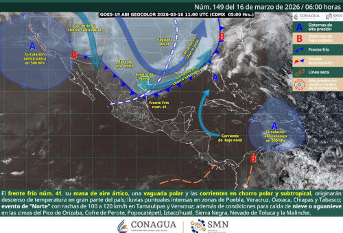 Saltillo, Coahuila de Zaragoza; 16 de marzo de 2026.– La Secretaría de Gobierno, a través de la Subsecretaría de Protección Civil del Estado, informa que el frente frío número 41, en interacción con su masa de aire ártico, se desplazará rápidamente sobre la vertiente del Golfo de México.