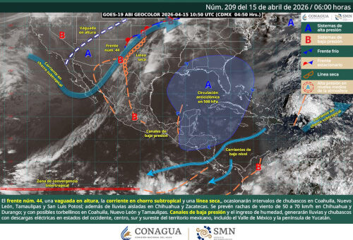Saltillo, Coahuila de Zaragoza; 15 de abril de 2026.– La Secretaría de Gobierno, a través de la Subsecretaría de Protección Civil del Estado, informa que este día, una línea seca sobre el norte del país, en interacción con el frente frío número 44, una vaguada en altura y la corriente en chorro subtropical, generará condiciones de inestabilidad atmosférica en Coahuila.