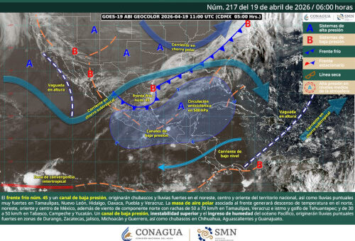 Saltillo, Coahuila de Zaragoza; 19 de abril de 2026. – La Secretaría de Gobierno, a través de la Subsecretaría de Protección Civil del Estado, informa que el frente frío número 45 se desplazará sobre el noreste del país y el litoral del Golfo de México, en interacción con un canal de baja presión en el sureste, lo que generará condiciones de inestabilidad en la región.