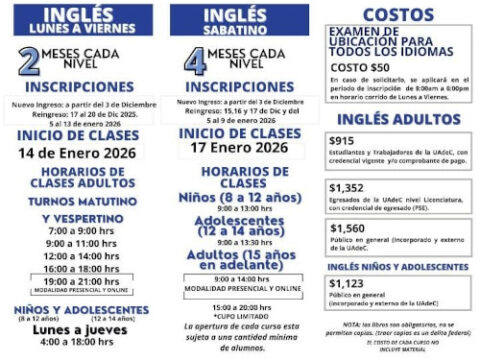 TORREÓN, Coahuila. 14 de enero de 2026. A partir del 14 de enero de 2026 elCentro de Idiomas Unidad Laguna de la Universidad Autónoma de Coahuila,impartirá cursos de inglés en Ciudad Universitaria Campus Torreón, con el objetivode brindar un espacio más cercano a la comunidad estudiantil y público en general. Se dará inicio con el Curso de Inglés Nivel 1 en modalidad presencial de lunes aviernes en un horario de…