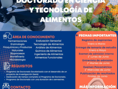 SALTILLO, Coahuila. 19 de enero de 2026. La Universidad Autónoma de Coahuila através de la Facultad de Ciencias Químicas, invita a cursar el Doctorado en Ciencia yTecnología de Alimentos, que está dirigido a maestros en ciencias de las áreas deQuímica, Nutrición, Biología Molecular, Evaluación Sensorial, Microbiología,Tecnología de Alimentos, Ingeniería de Alimentos, Biotecnología, Ingeniería Química,Bioingeniería y áreas afines. Tiene una duración de seis semestres y se enfoca en diversas áreas delconocimiento,…