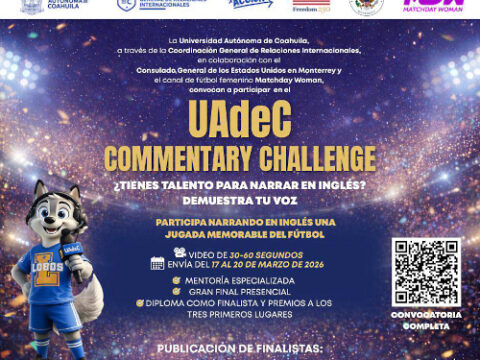 SALTILLO, Coahuila. 26 de febrero de 2026. La Universidad Autónoma de Coahuila,a través de la Coordinación de Relaciones Internacionales, en colaboración con elConsulado General de los Estados Unidos en Monterrey y el canal de fútbolfemenino Matchday Woman, invita a participar en el “UAdeC CommentaryChallenge” un reto que fomenta la expresión oral en inglés mediante el análisisdeportivo con enfoque internacional. El concurso está dirigido a estudiantes de nivel licenciatura o que…