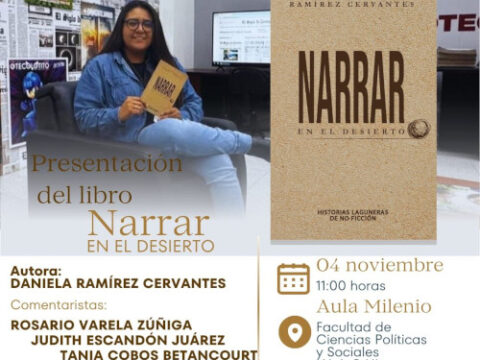 TORREÓN, Coahuila. 3 de noviembre de 2025. La Universidad Autónoma deCoahuila, a través del Centro de Investigación en Ciencias Sociales (CICS) y laFacultad de Ciencias Políticas y Sociales (FCPyS), invita a la comunidaduniversitaria y al público en general a la presentación del libro “Narrar en el desierto. Historias Laguneras de no ficción”, el próximo 4 de noviembre a las 11:00 horas en elAula Milenio de la FCPyS Unidad Laguna. “Narrar…