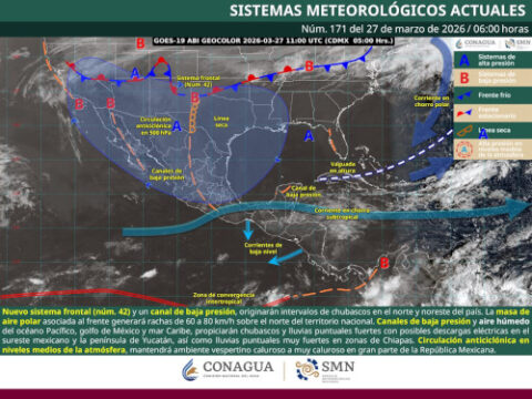 Saltillo, Coahuila de Zaragoza; 27 de marzo de 2026.– La Secretaría de Gobierno, a través de la Subsecretaría de Protección Civil del Estado, informa que el ingreso del frente frío número 42 al norte del país, en interacción con una masa de aire polar, generará condiciones de inestabilidad en la entidad. Se prevén vientos fuertes con rachas de 60 a 80 km/h, con posibilidad de tolvaneras, así como cielo de…