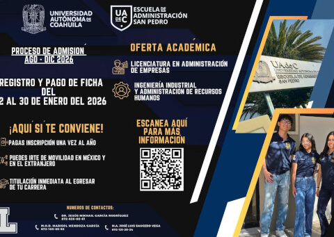 SAN PEDRO, Coahuila. 26 de enero de 2026. La Universidad Autónoma deCoahuila, a través de la Escuela de Administración San Pedro, invita a las y losjóvenes interesados a cursar la Licenciatura en Administración de Empresas o laIngeniería Industrial y Administración de Recursos Humanos para al semestreagosto–diciembre 2026, dos programas educativos con enfoque de formaciónintegral y orientados a responder a las actuales necesidades del sector productivo. La Licenciatura en Administración de…